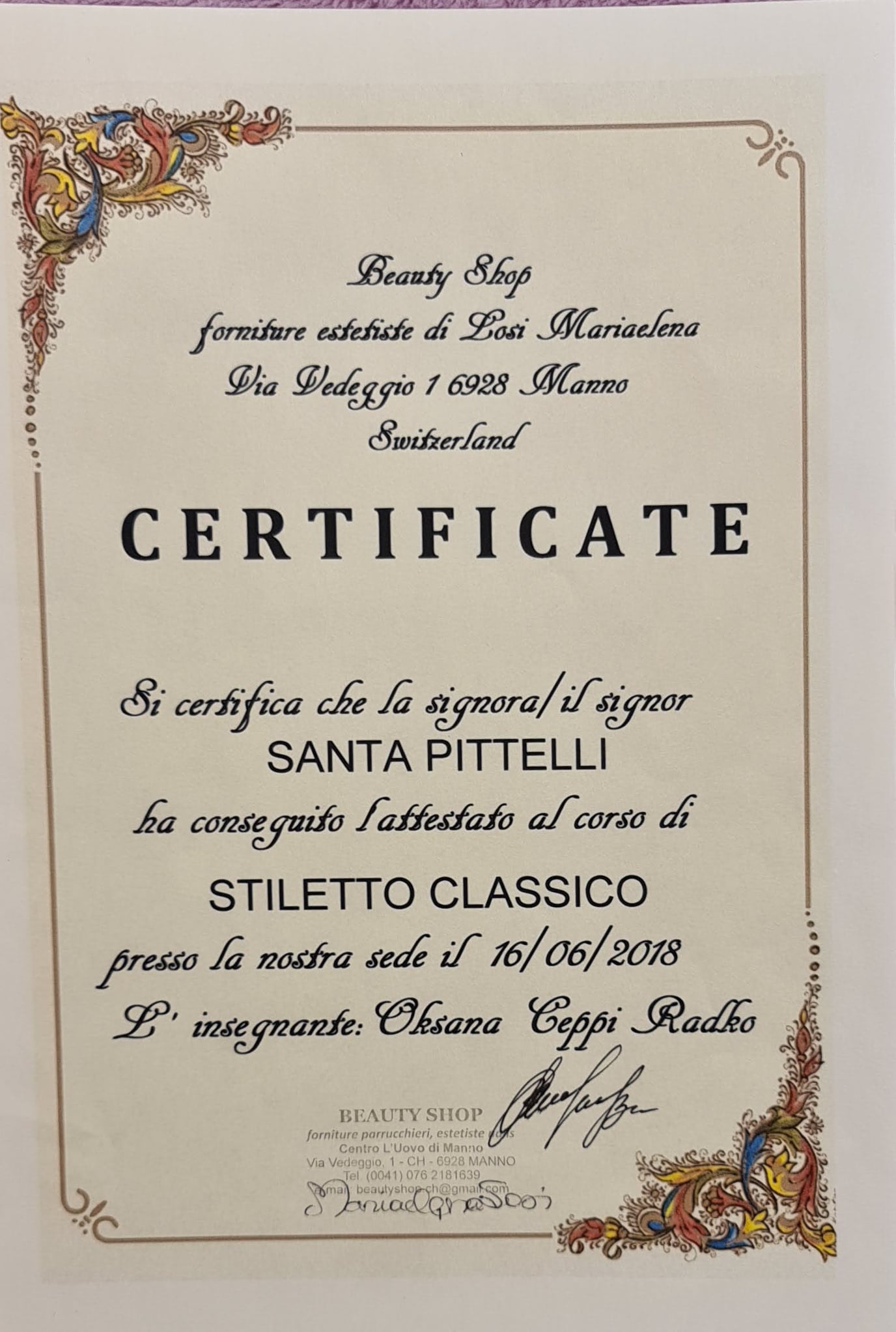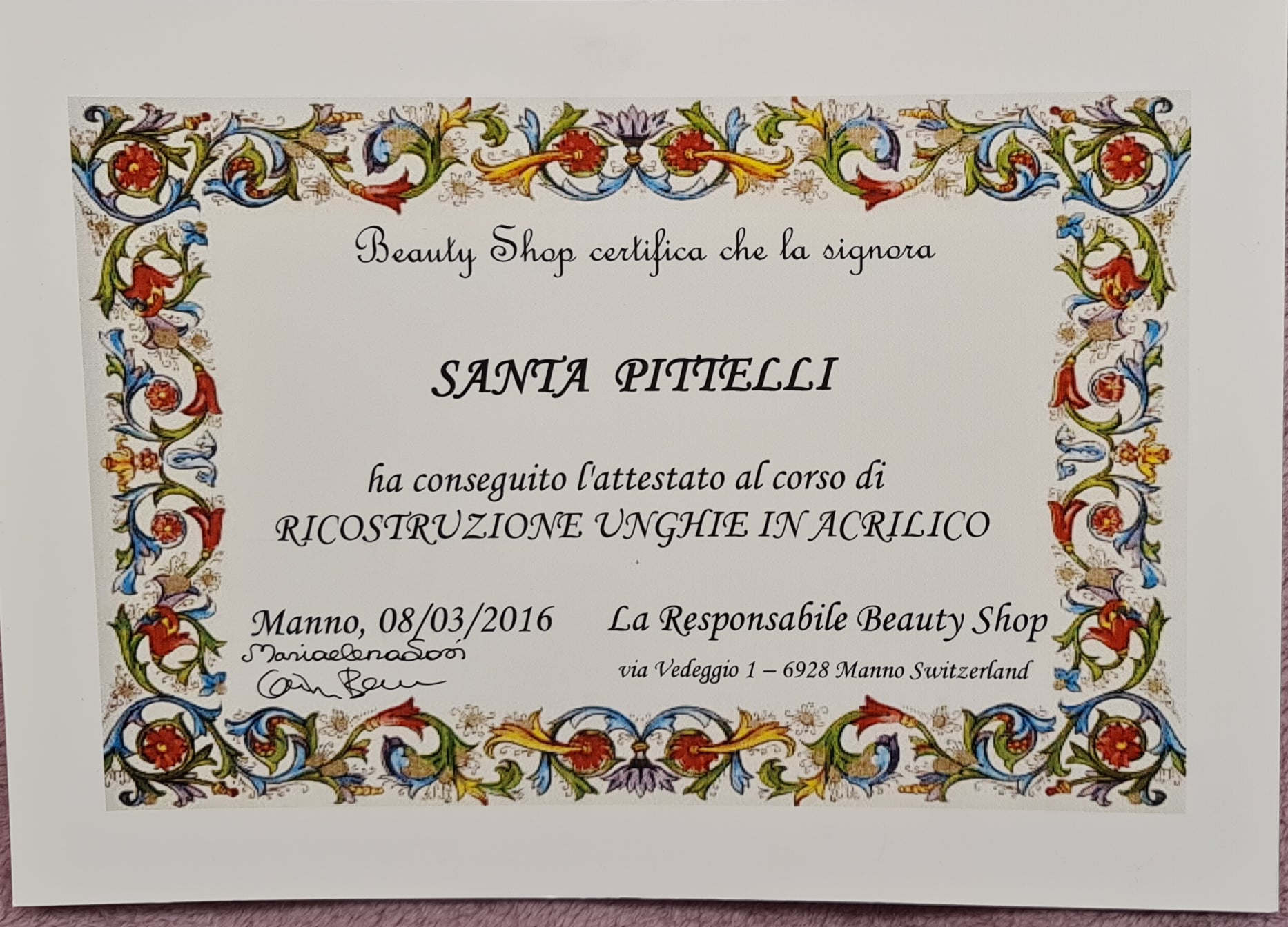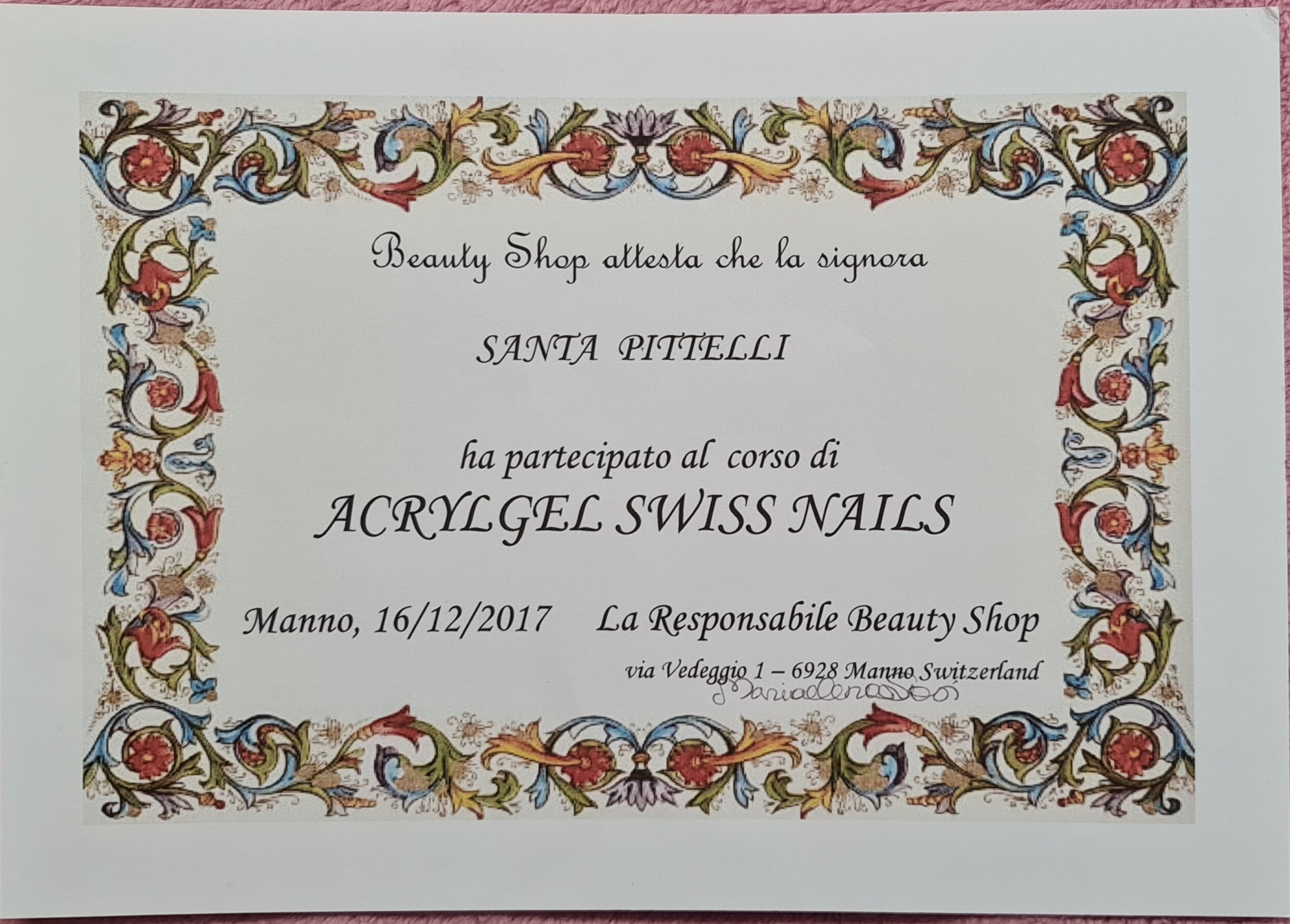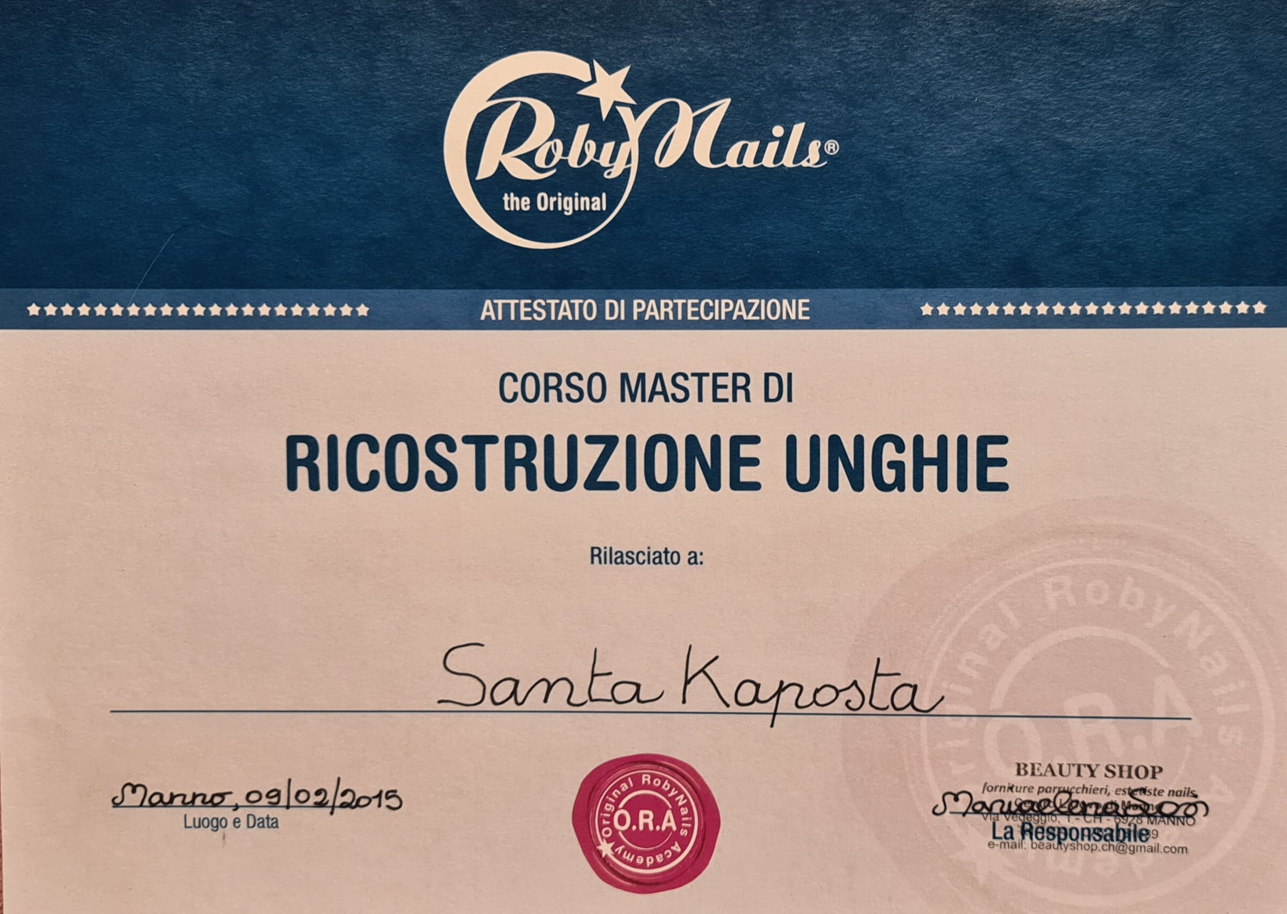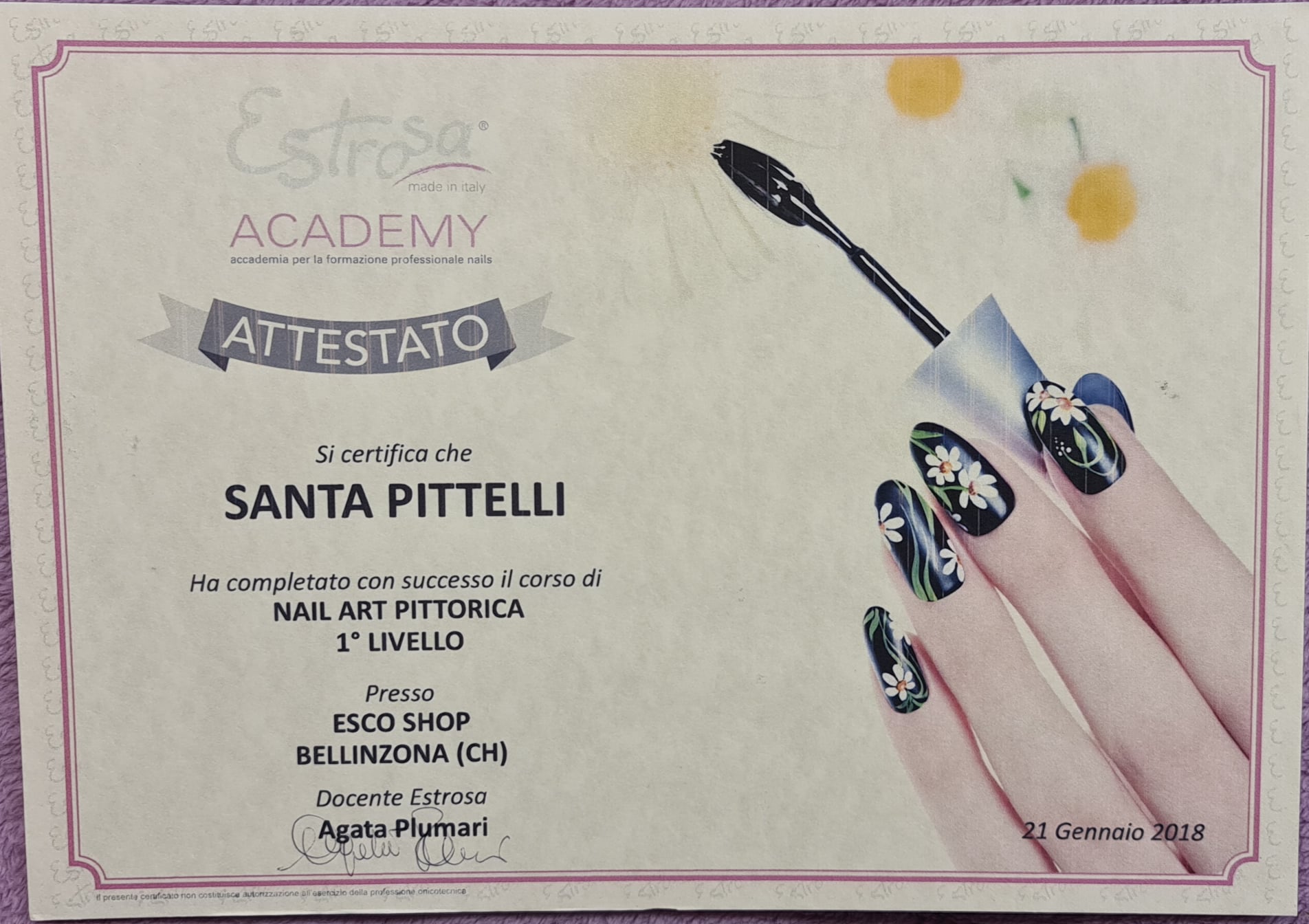 Santa, costantemente aggiornata con oltre 50 certificazioni professionali, ha ottenuto riconoscimenti a livello internazionale, conquistando le prime posizioni nelle competizioni di onicotecnica. Il suo studio è un punto di riferimento per chi cerca un servizio di altissimo livello, con un’attenzione speciale per ogni dettaglio. I clienti, provenienti da tutta la Svizzera e l’Italia, apprezzano la sua competenza, la passione per il suo lavoro e l’atmosfera accogliente che rende ogni visita un’esperienza unica di bellezza e relax.