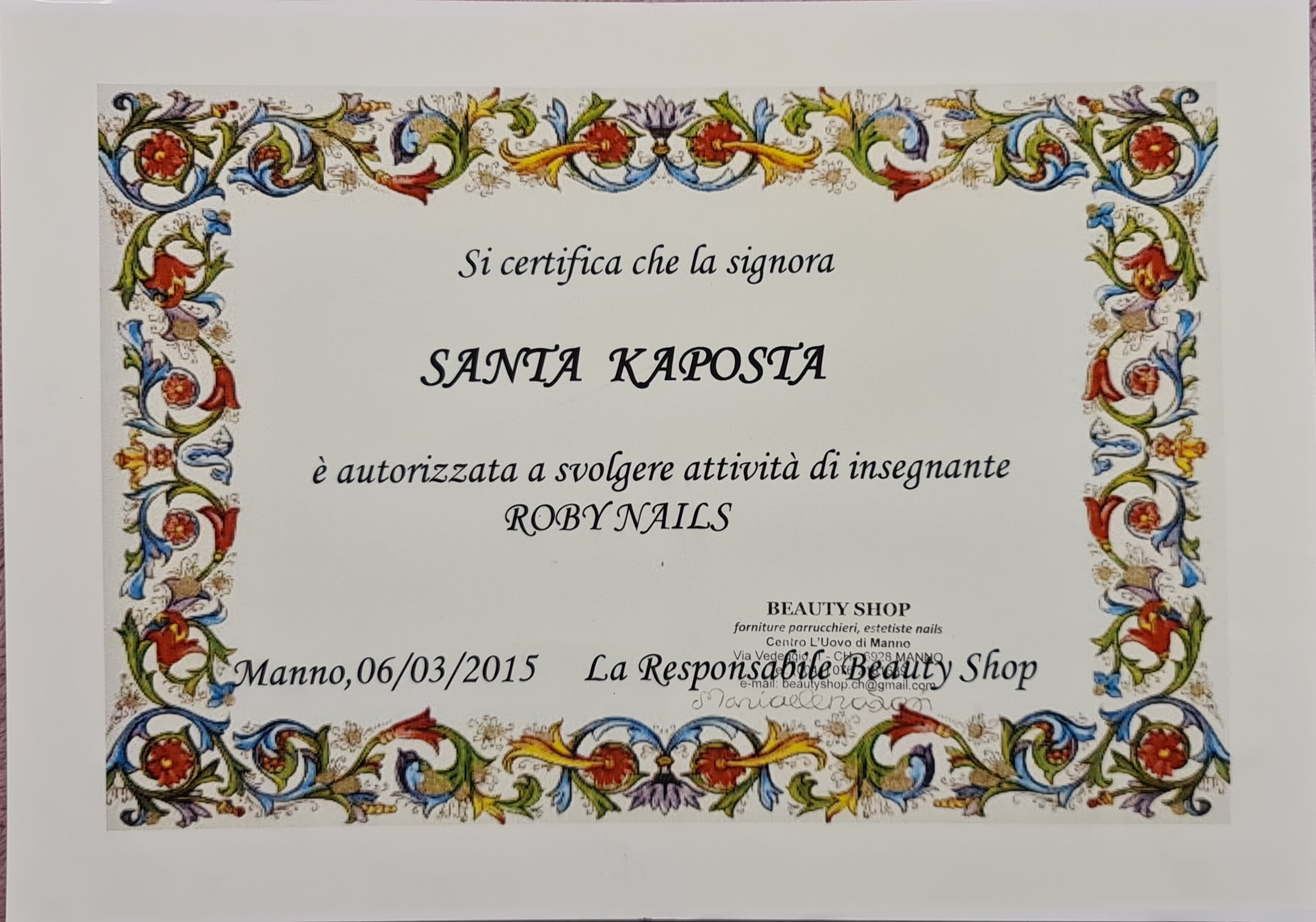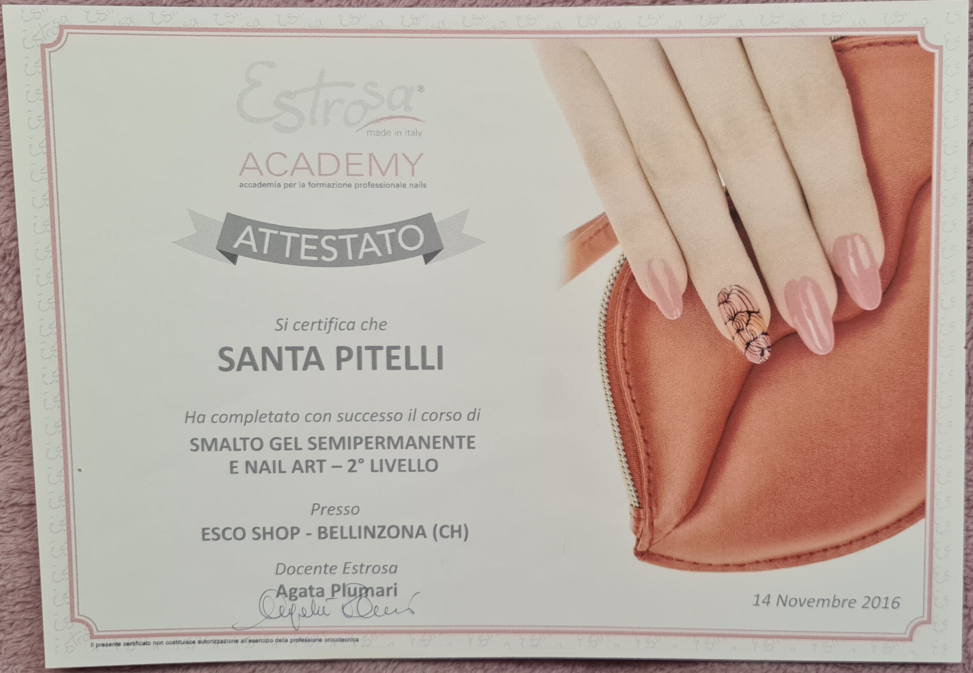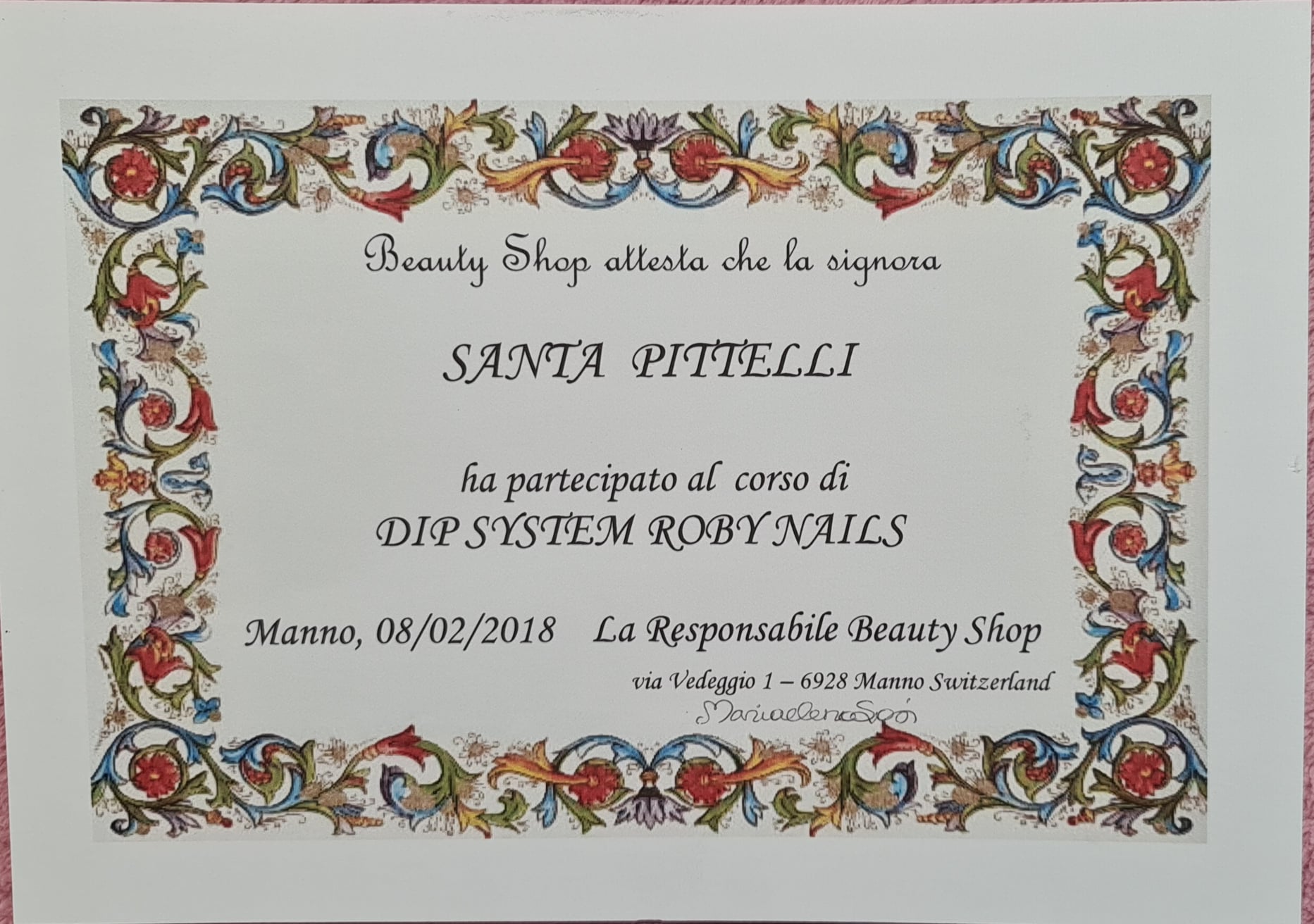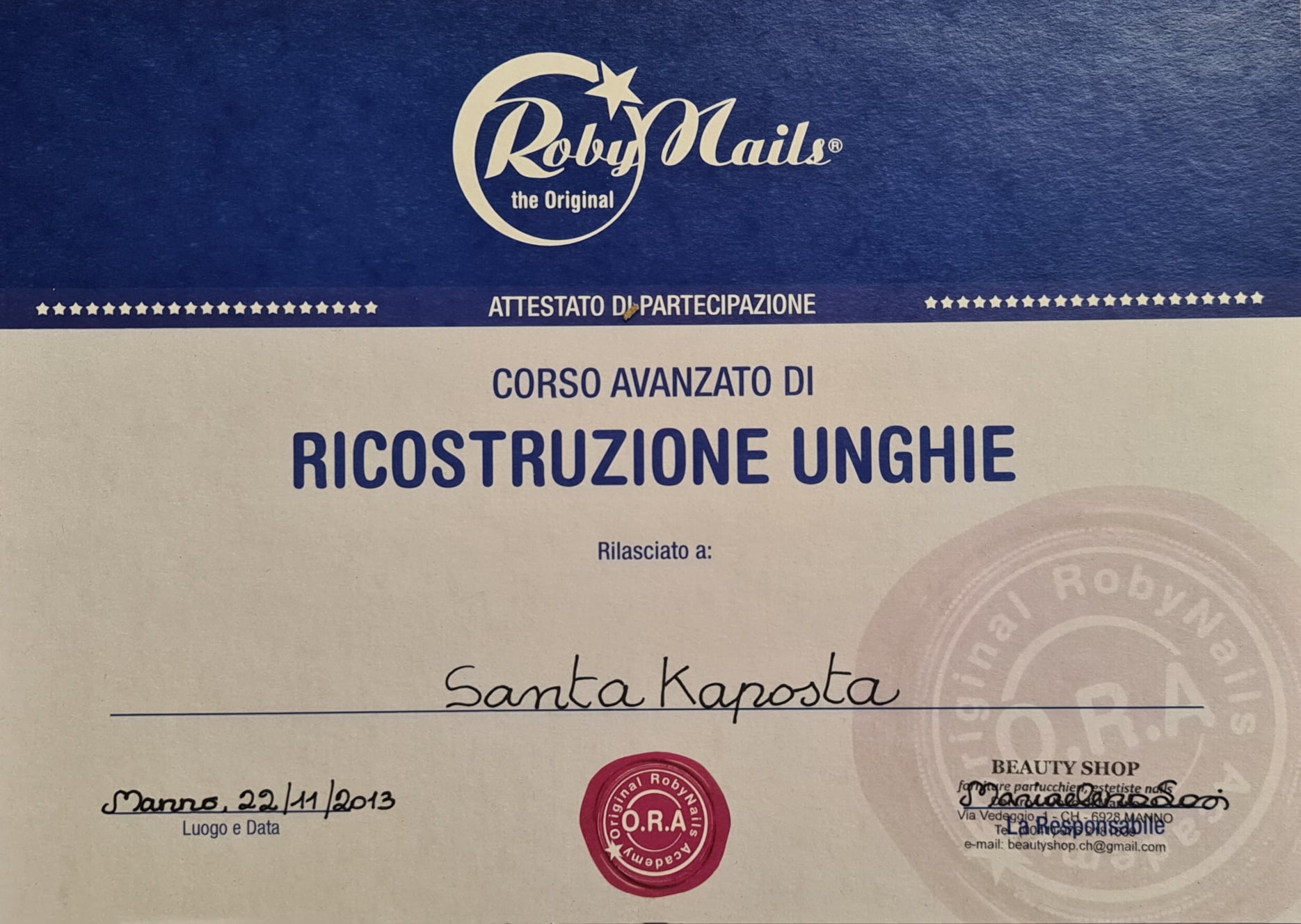 Santa, costantemente aggiornata con oltre 50 certificazioni professionali, ha ottenuto riconoscimenti a livello internazionale, conquistando le prime posizioni nelle competizioni di onicotecnica. Il suo studio è un punto di riferimento per chi cerca un servizio di altissimo livello, con un’attenzione speciale per ogni dettaglio. I clienti, provenienti da tutta la Svizzera e l’Italia, apprezzano la sua competenza, la passione per il suo lavoro e l’atmosfera accogliente che rende ogni visita un’esperienza unica di bellezza e relax.