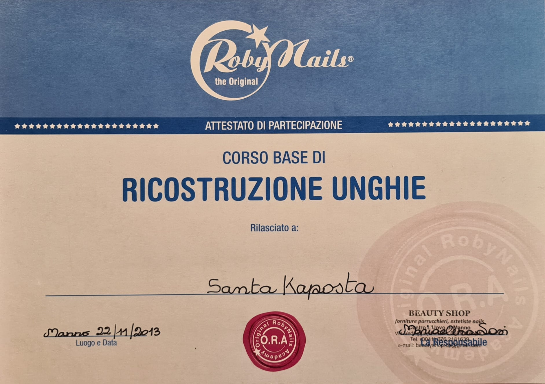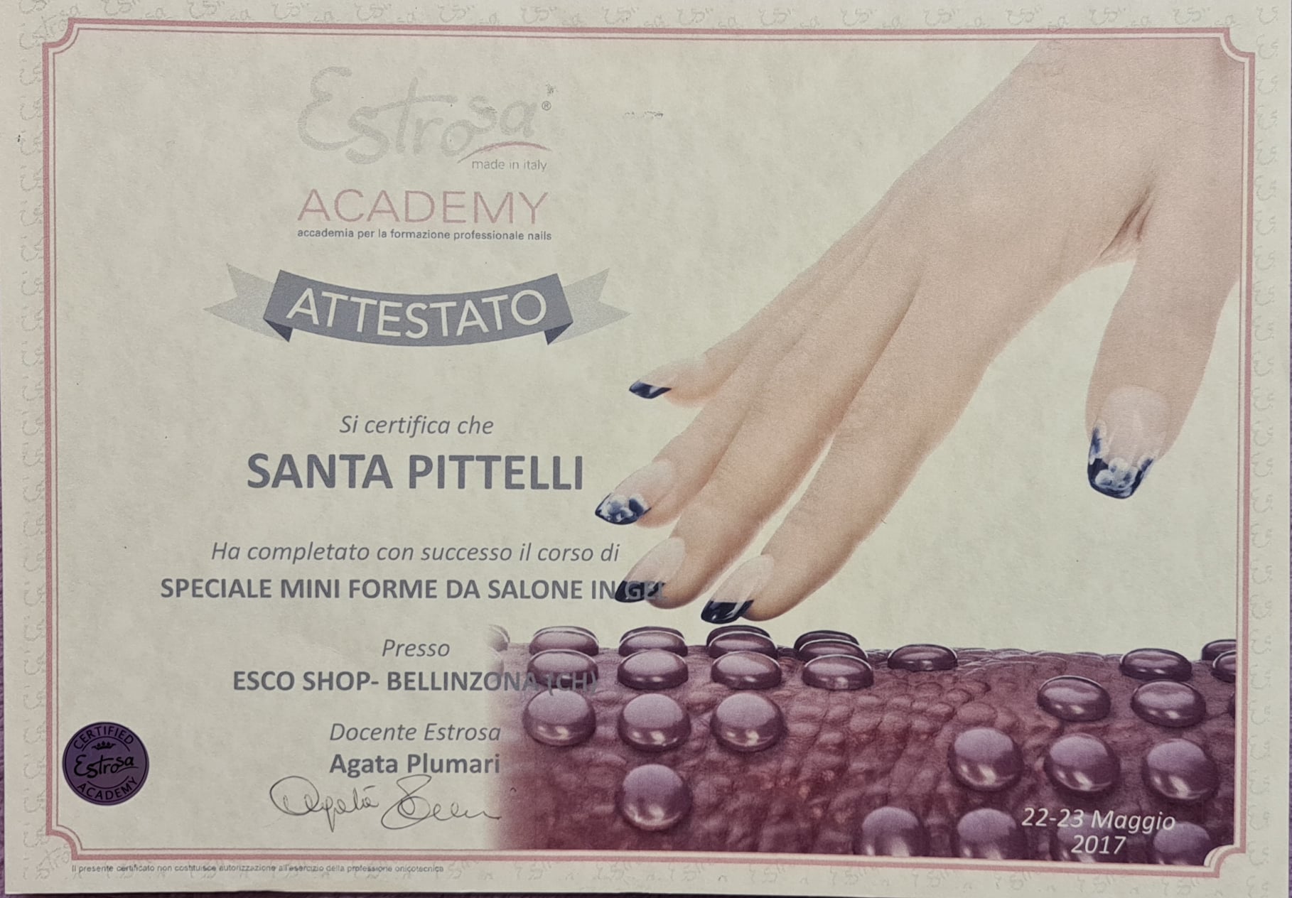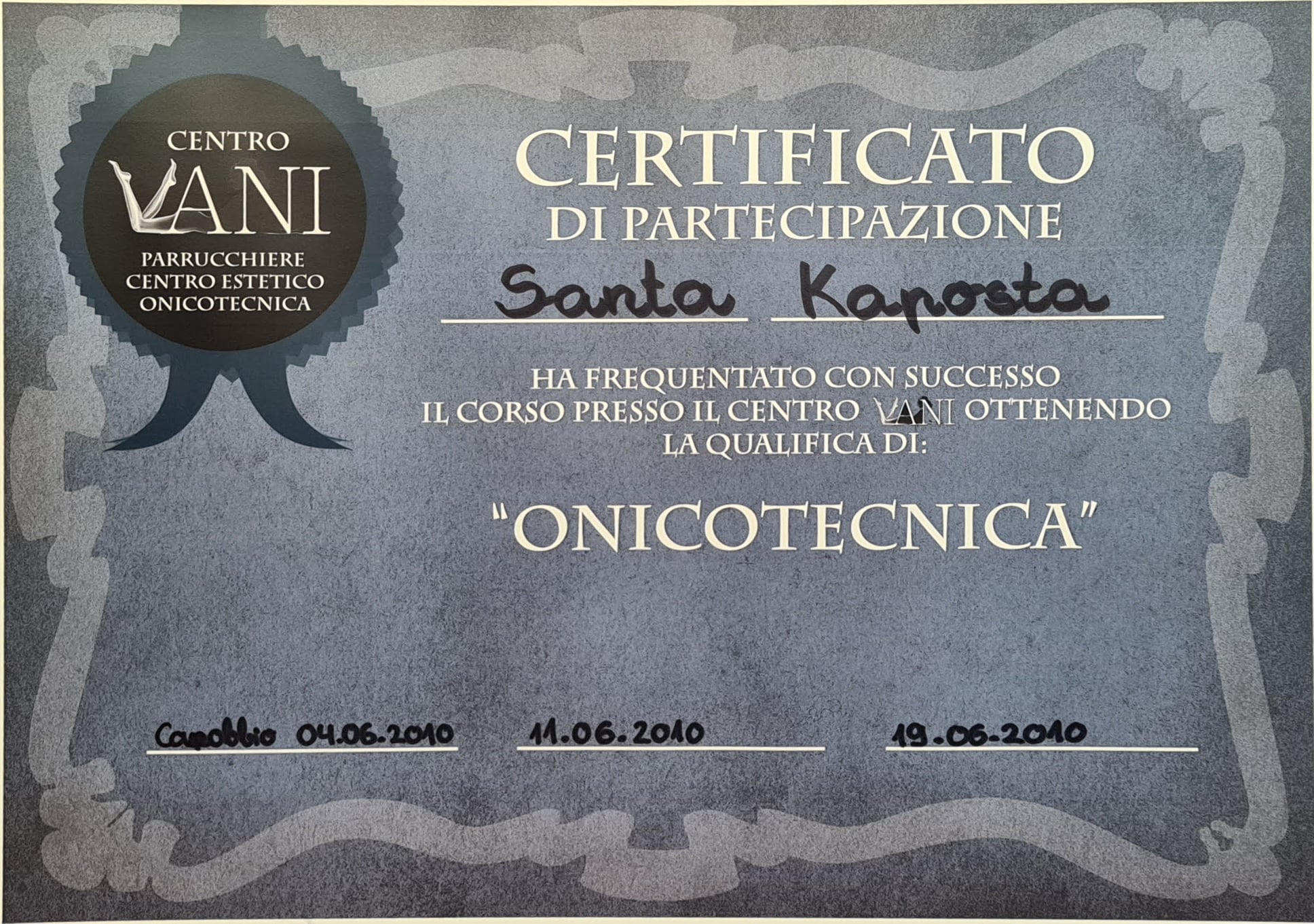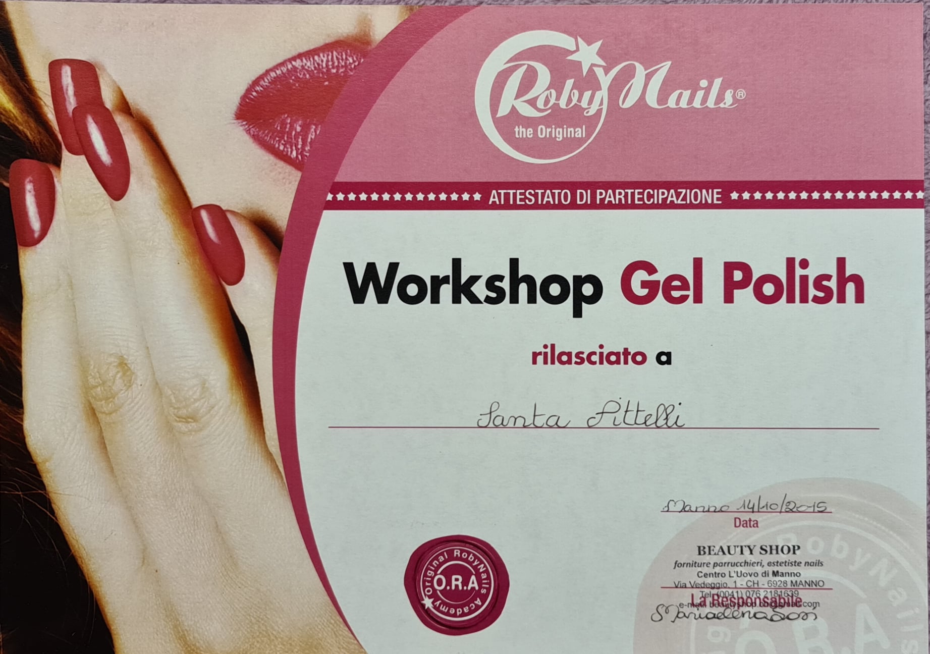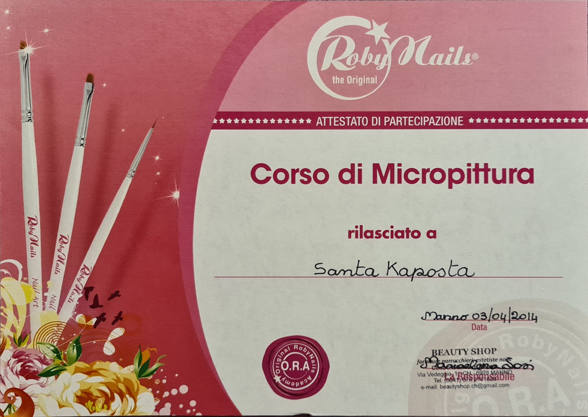Santa, costantemente aggiornata con oltre 50 certificazioni professionali, ha ottenuto riconoscimenti a livello internazionale, conquistando le prime posizioni nelle competizioni di onicotecnica. Il suo studio è un punto di riferimento per chi cerca un servizio di altissimo livello, con un’attenzione speciale per ogni dettaglio. I clienti, provenienti da tutta la Svizzera e l’Italia, apprezzano la sua competenza, la passione per il suo lavoro e l’atmosfera accogliente che rende ogni visita un’esperienza unica di bellezza e relax.