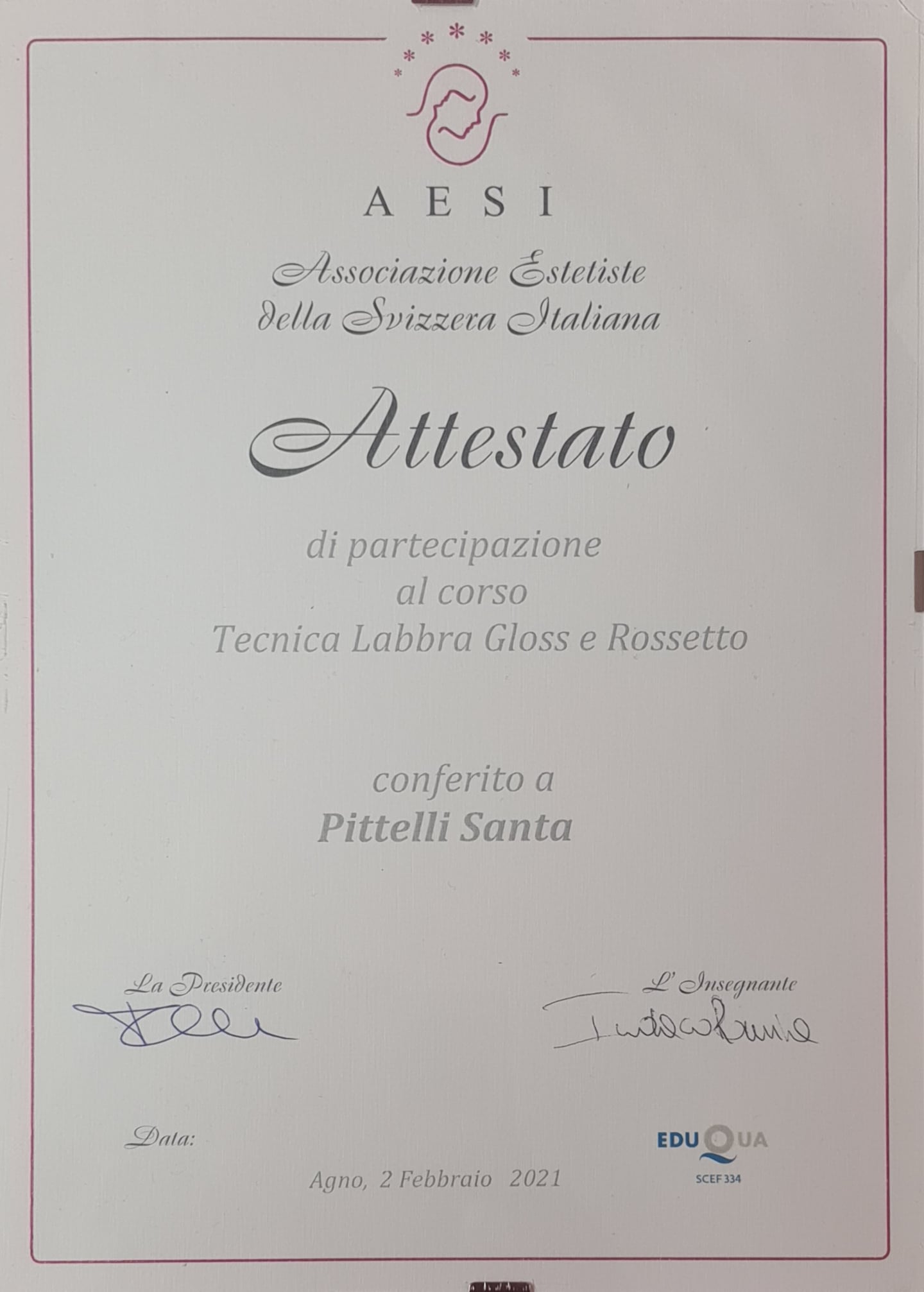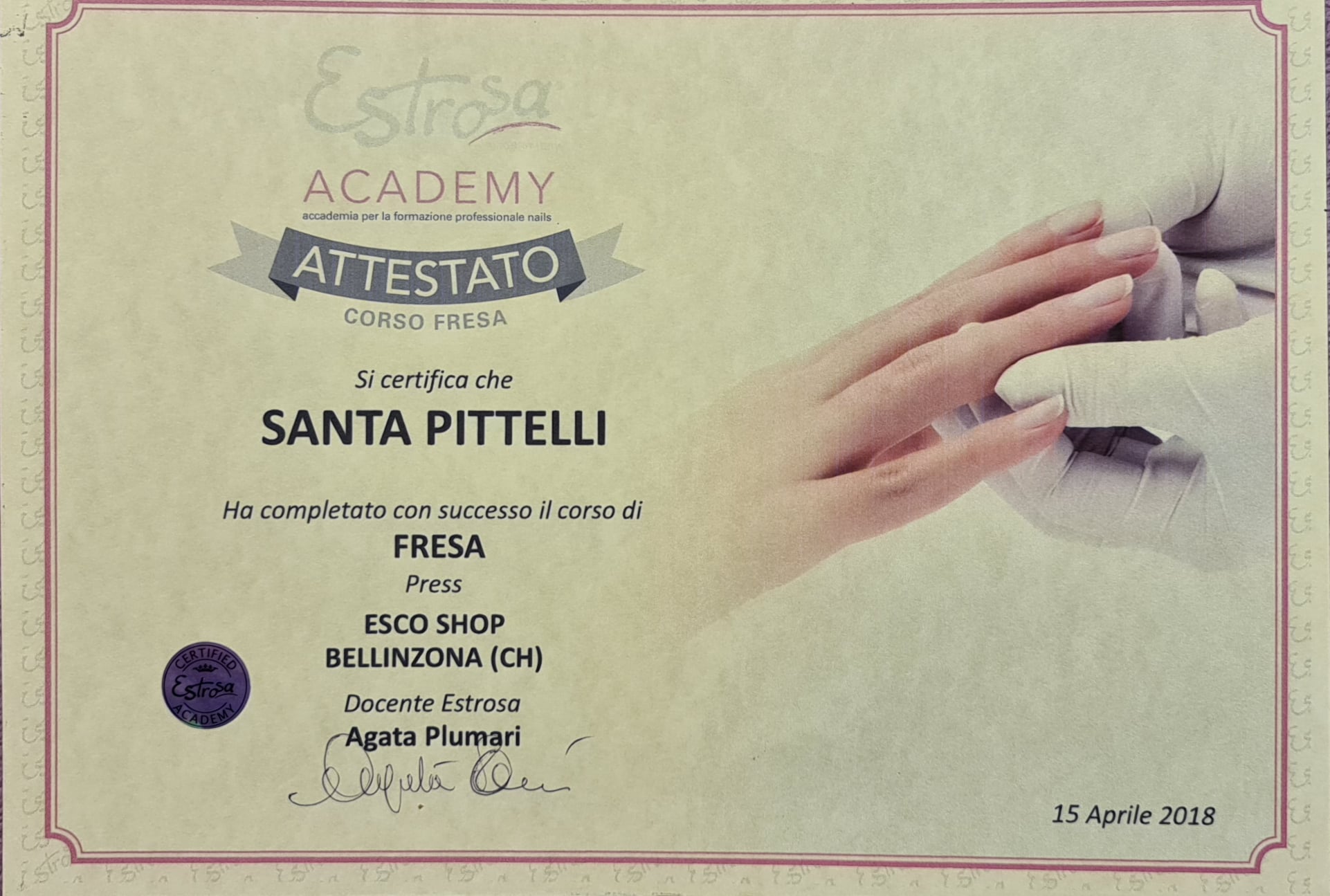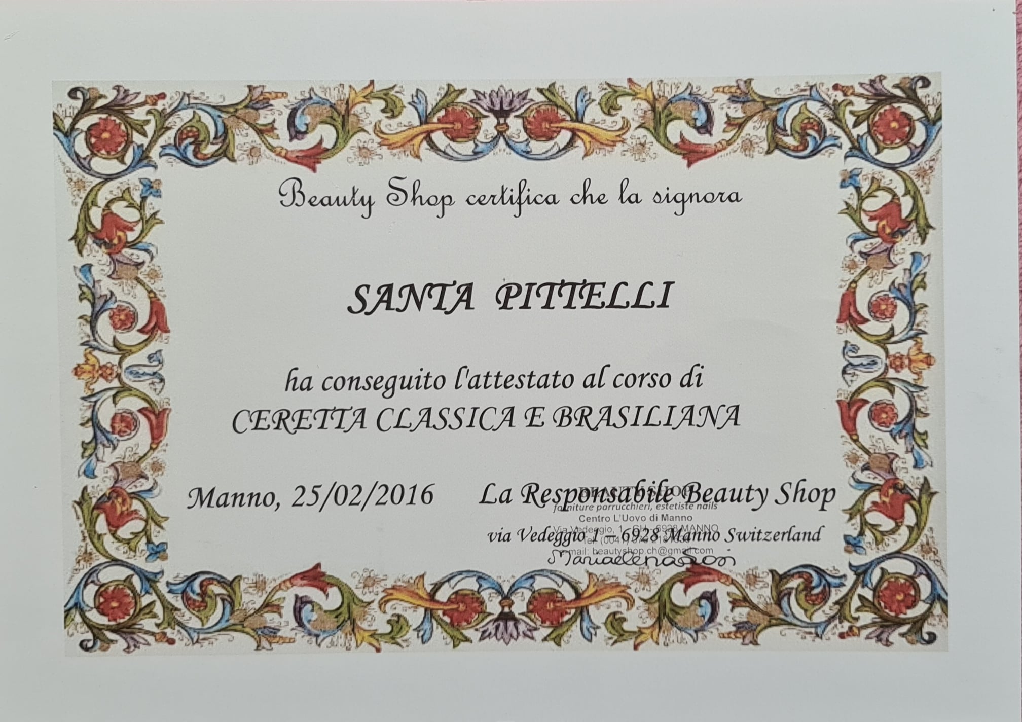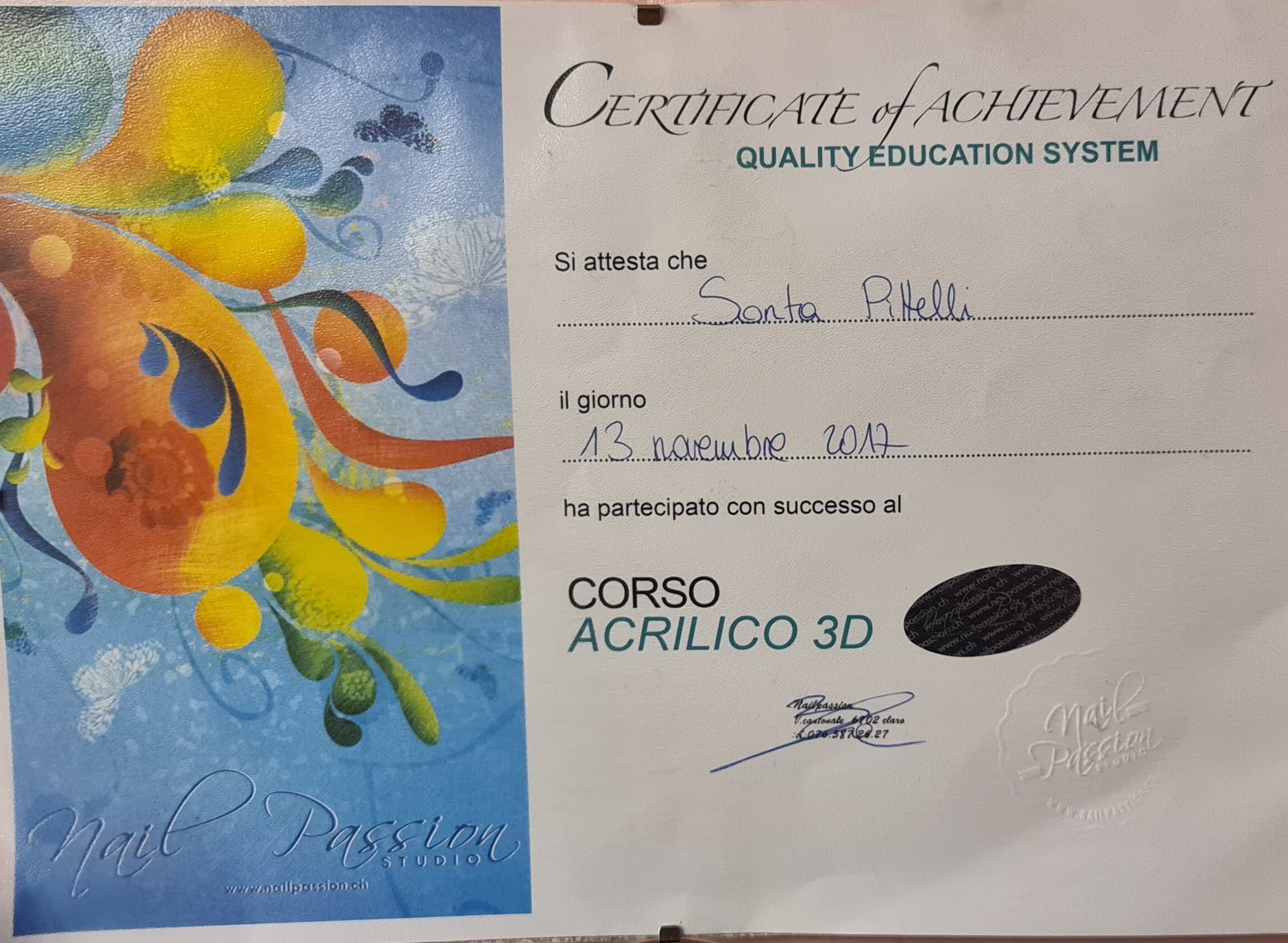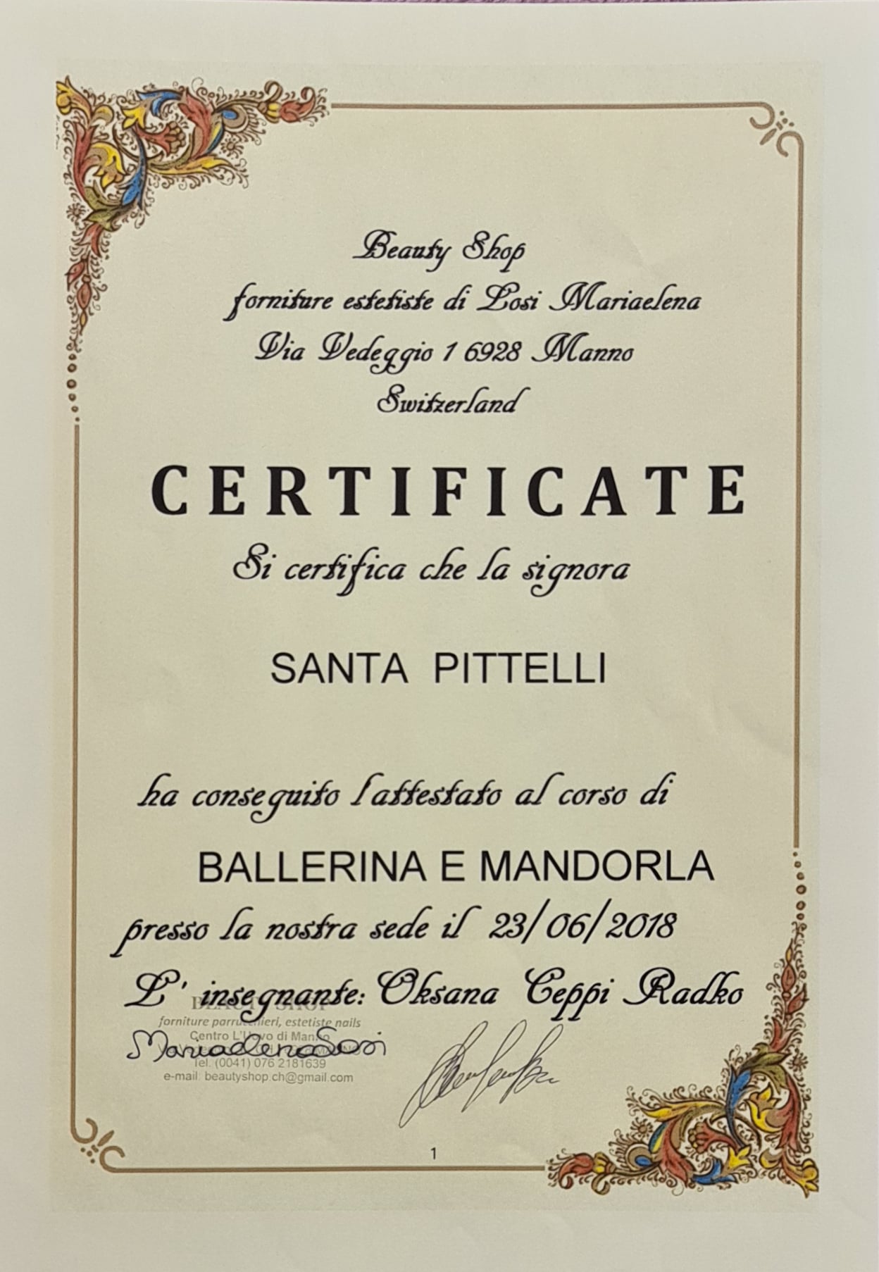 Santa, costantemente aggiornata con oltre 50 certificazioni professionali, ha ottenuto riconoscimenti a livello internazionale, conquistando le prime posizioni nelle competizioni di onicotecnica. Il suo studio è un punto di riferimento per chi cerca un servizio di altissimo livello, con un’attenzione speciale per ogni dettaglio. I clienti, provenienti da tutta la Svizzera e l’Italia, apprezzano la sua competenza, la passione per il suo lavoro e l’atmosfera accogliente che rende ogni visita un’esperienza unica di bellezza e relax.